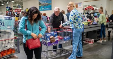 Customers look over clothing items displayed on April 18, 2025 at a Costco branch in Niantic, Connecticut.