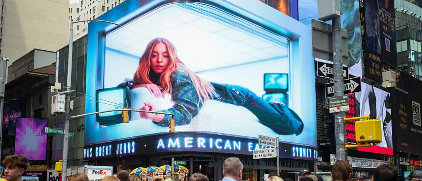 An American Eagle advertisement featuring actress Sydney Sweeney on a billboard in Times Square in New York, US, on Thursday, Aug. 7, 2025.
