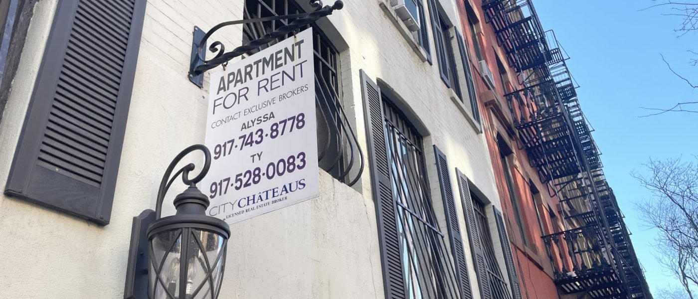 A sign on the side of a building in Hell’s Kitchen, New York City, advertising an apartment is available for rent through a real estate broker.