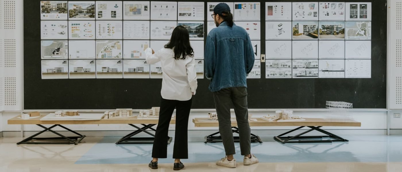 Two architecture teachers discuss a student’s final project work.