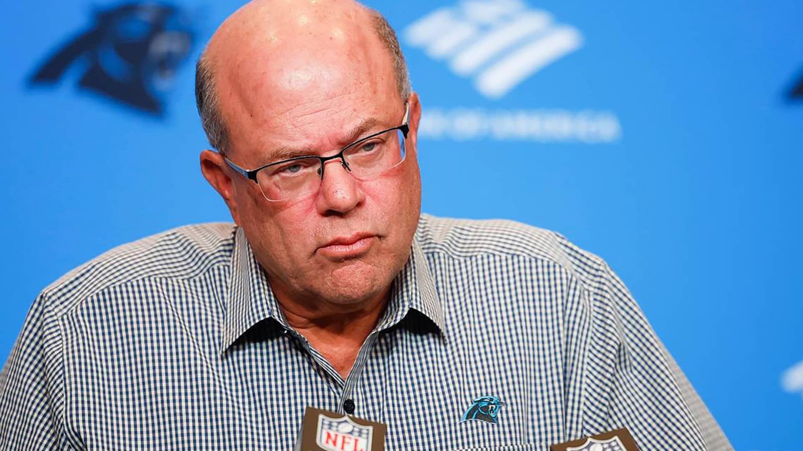 Carolina Panthers owner David Tepper listens to a question during a press conference in 2022.