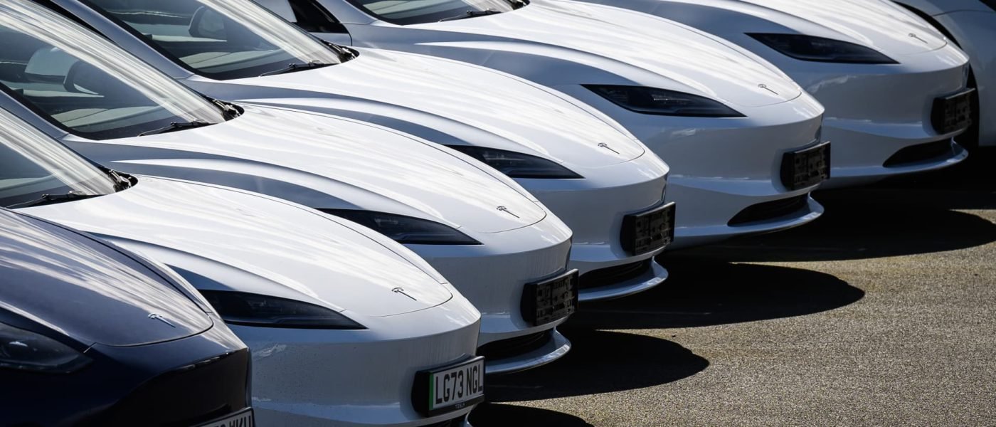 Rows of new Tesla cars are seen in a holding area near a customer collection point on April 15, 2024 in London, England.