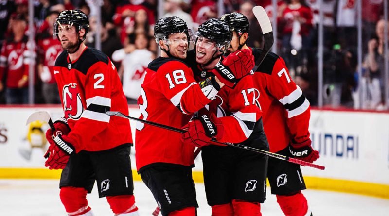 Read MoreThe New Jersey Devils celebrate after Simon Nemec #17 scores the game-winning-goal in double overtime of Game Three of the