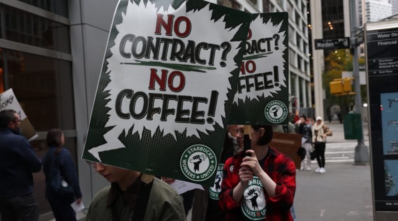 Read MoreStarbucks baristas gather outside a Starbucks store as they protest against the company during a rally to demand a new