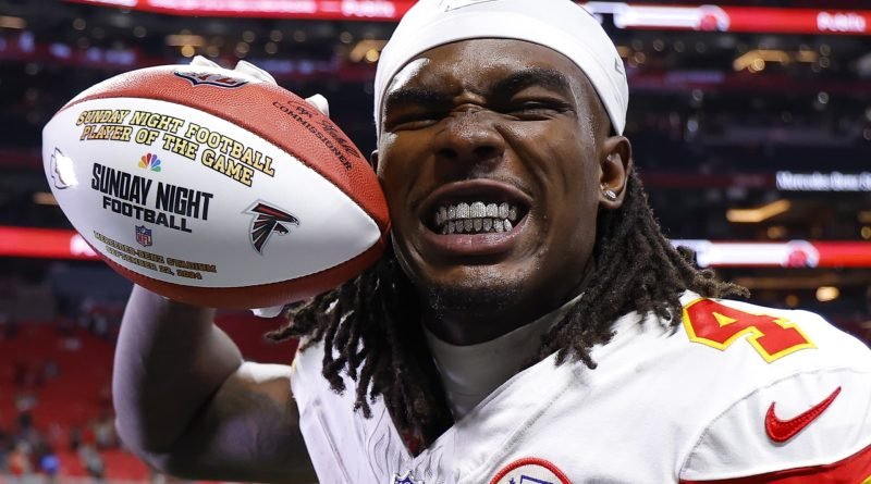 Read MoreRashee Rice #4 of the Kansas City Chiefs reacts with the NBC Sunday Night Football Player of the Game football