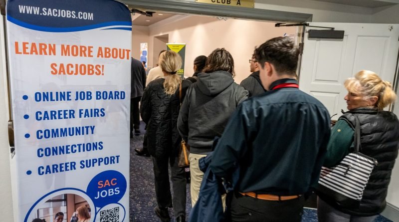 Read MoreJob seekers wait to enter the SacJobs Career job fair in Sacramento, California, US, on Thursday, Nov. 13, 2025. David