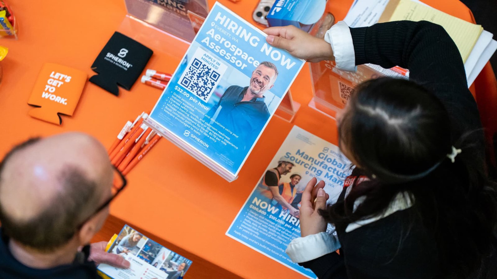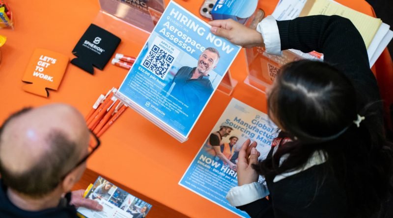 Read MoreA recruiter displays information while speaking to a jobseeker during the WorkSource North Seattle Career Fair in Seattle, Washington, US,