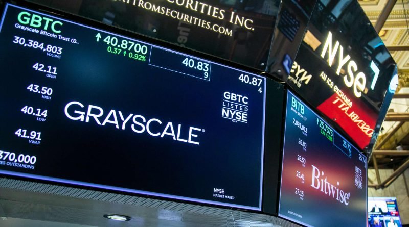 Read MoreGrayscale Bitcoin Trust ETF signage on the floor of the New York Stock Exchange in New York, US, on Thursday,