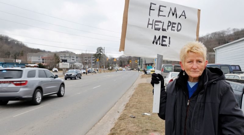 Read MoreSwannanoa resident Lucy Bickers, who received assistance from FEMA after Hurricane Helene damaged her property, holds a sign in support