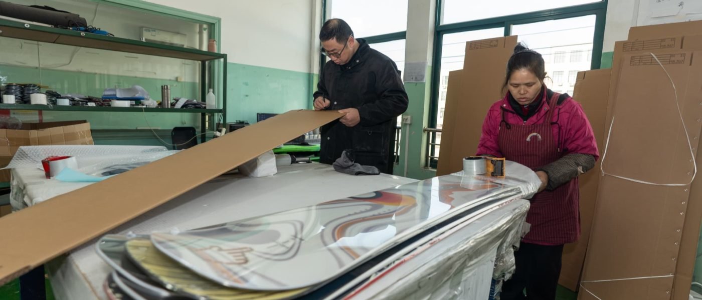 NINGBO, CHINA – JANUARY 22: Employees work on the production line of snowboards at a workshop to meet the orders on January 22, 2026 in Ningbo, Zhejiang Province of China.