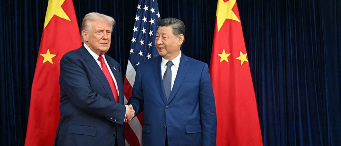 US President Donald Trump (L) and China’s President Xi Jinping shake hands as they arrive for talks at the Gimhae Air Base, located next to the Gimhae International Airport in Busan on October 30, 2025. Donald Trump and Chinese leader Xi Jinping will seek a truce in their bruising trade war on October 30, with the US president predicting a “great meeting” but Beijing being more circumspect. (Photo by ANDREW CABALLERO-REYNOLDS / AFP) (Photo by ANDREW CABALLERO-REYNOLDS/AFP via Getty Images)