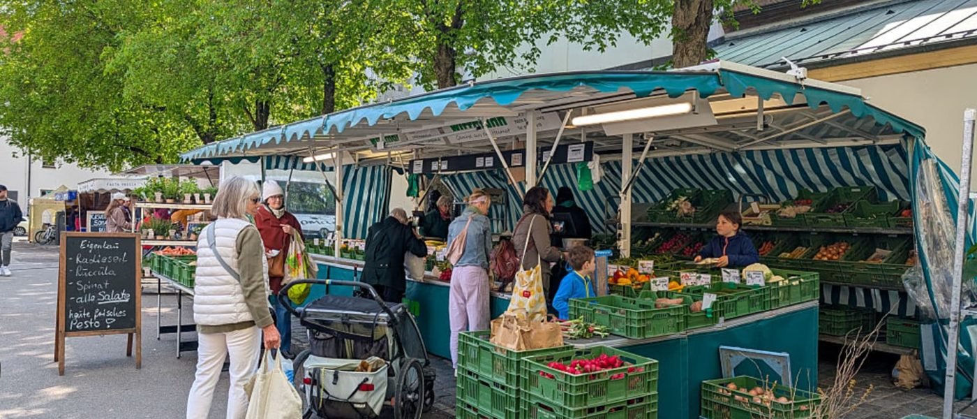 Shoppers buy fresh vegetables, fruit, and herbs at an outdoor produce market under green-striped canopies in Regensburg, Upper Palatinate, Bavaria, Germany, on April 19, 2025.