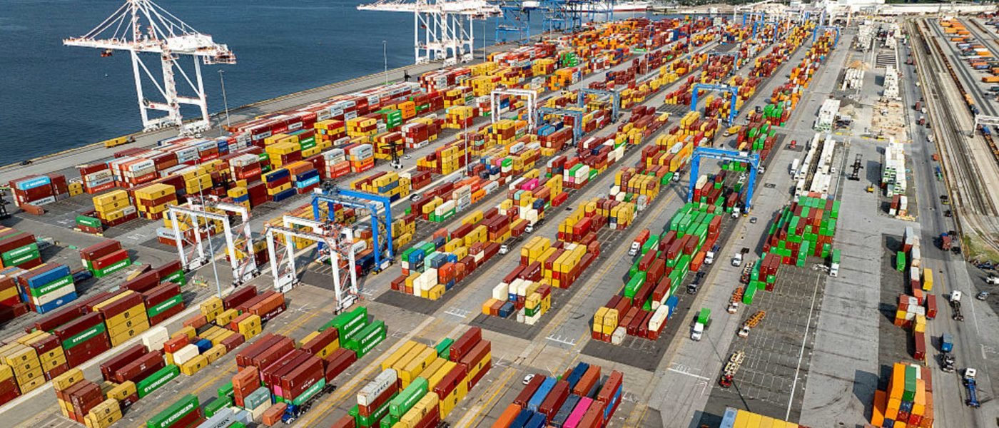 An aerial view of a cargo ship being loaded with shipping containers at the Port of Baltimore in Baltimore, Maryland, on August 7, 2025.
