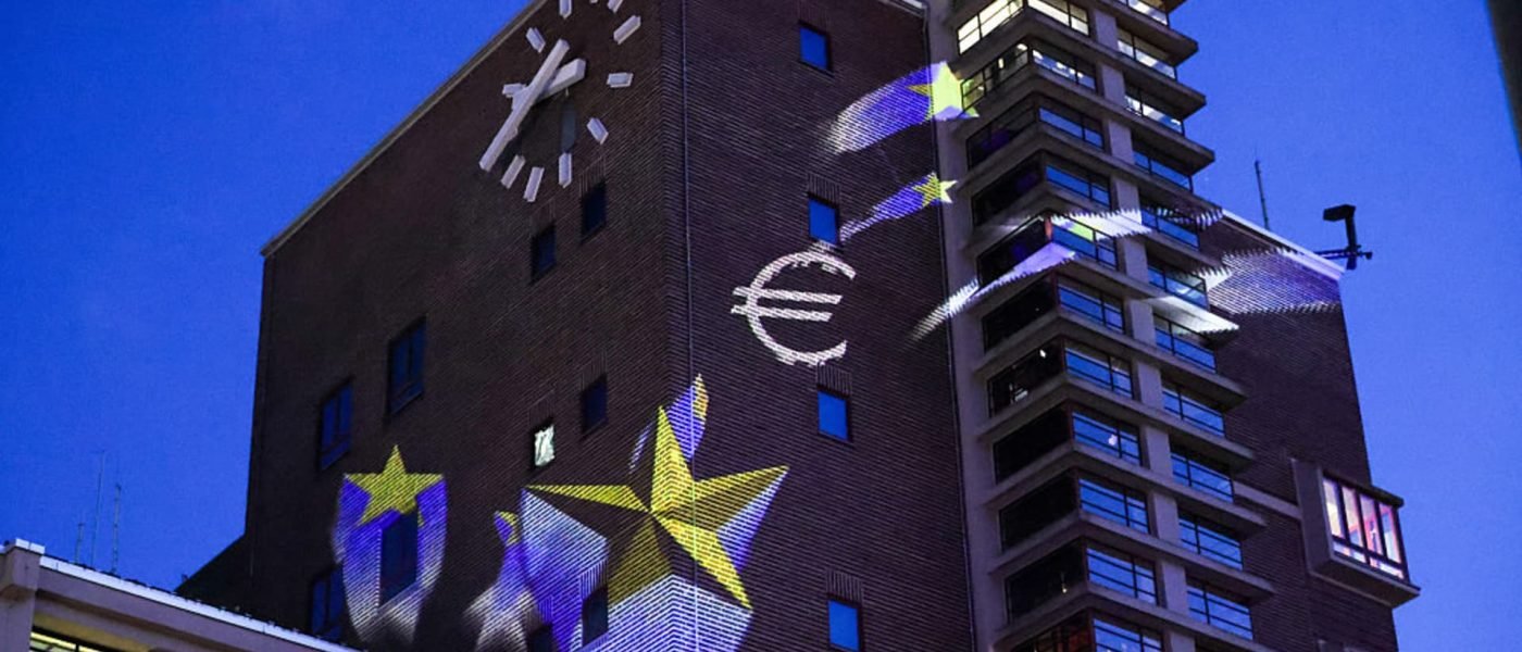 A projected illumination marking the 75th anniversary of the Schuman Declaration, on the Grossmarkthalle building at the European Central Bank headquarters in Frankfurt, Germany, on May 9, 2025.
