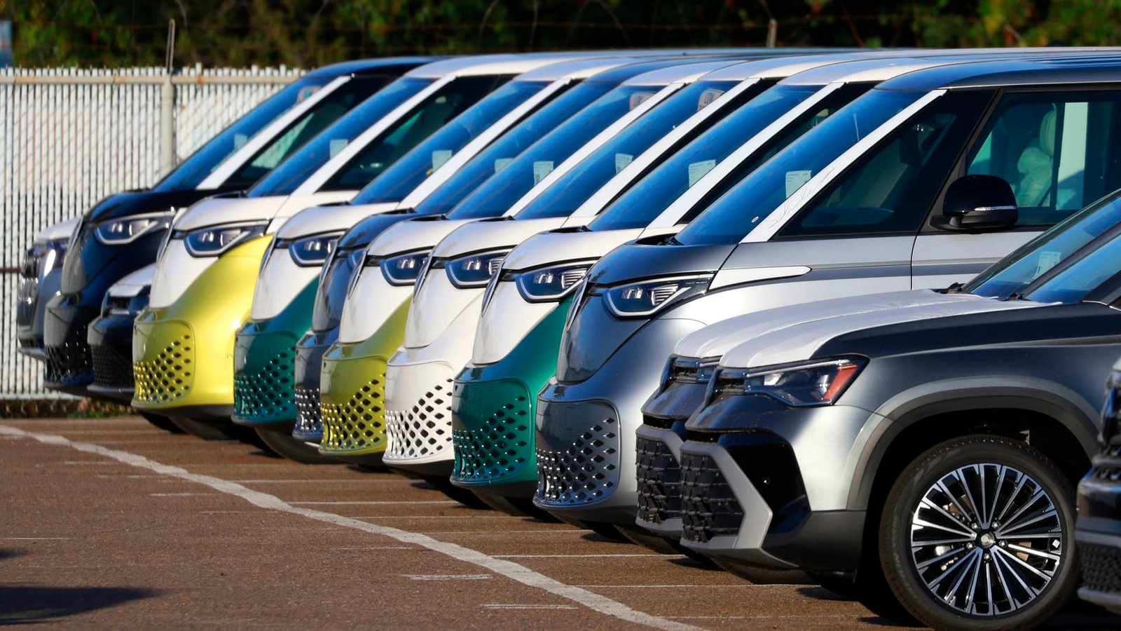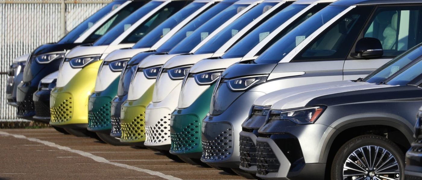 Rows of Volkswagen ID Buzz electric buses are parked at the National City Marine Terminal, a major port for vehicle imports and exports to the U.S.
