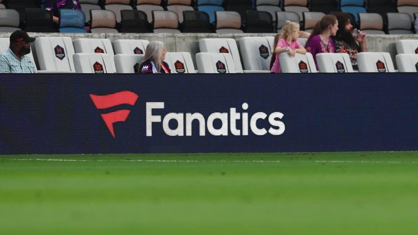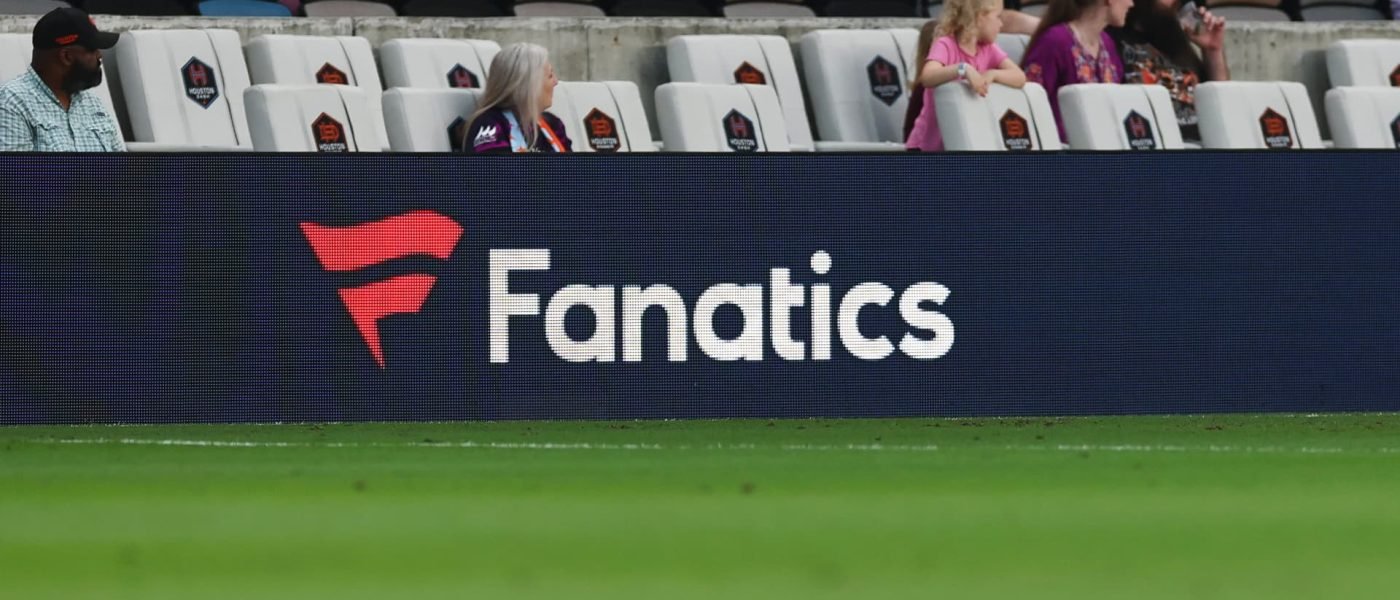 A Fanatics advertisement on the sideline billboard during the NWSL match between Houston Dash and Washington Spirit at Shell Energy Stadium on March 14, 2025 in Houston, Texas.