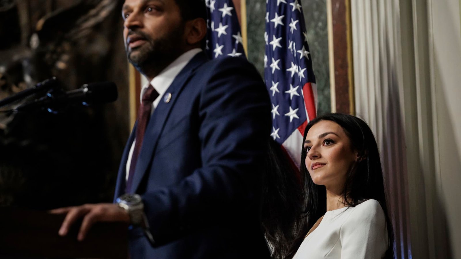 Alexis Wilkins looks at her boyfriend, Kash Patel, as he speaks after being sworn in as the new Director of the Federal Bureau of Investigations (FBI) by U.S. Attorney General Pam Bondi in the Eisenhower Executive Office Building at the White House on Feb. 21, 2025 in Washington, D.C.