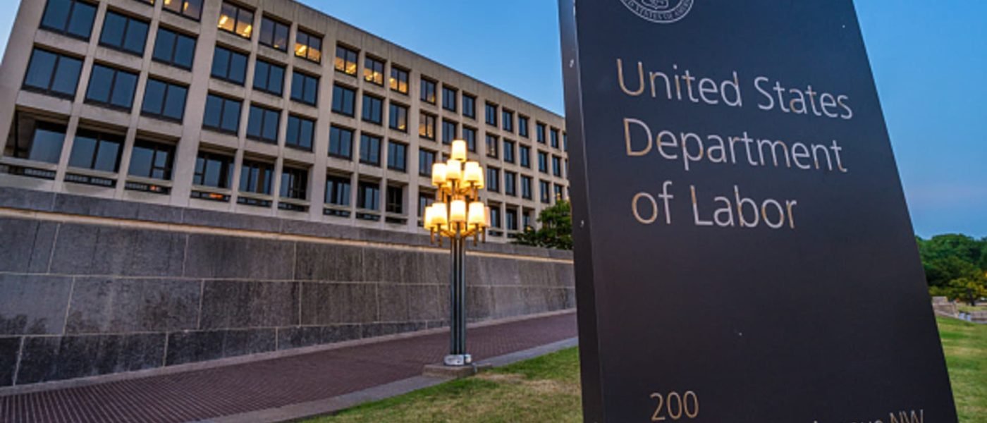 The US Department of Labor headquarters building is seen at dusk on June 21, 2024 in Washington, DC.