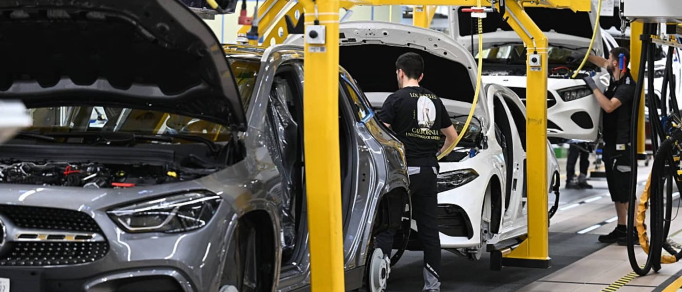 A general view of production lines at the Mercedes-Benz assembly plant on June 4, 2025 in Rastatt, Germany.