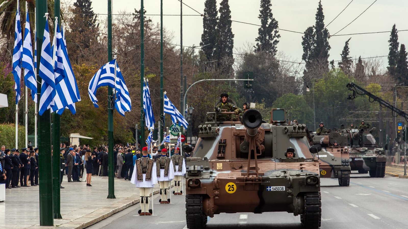 Military vehicles are seen during a military parade commemorating the Greek Independence Day in Athens, Greece, on March 25, 2025.
