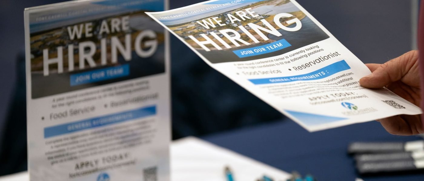 A jobseeker takes a flyer at a job fair at Brunswick Community College in Bolivia, North Carolina, on April 11, 2024.