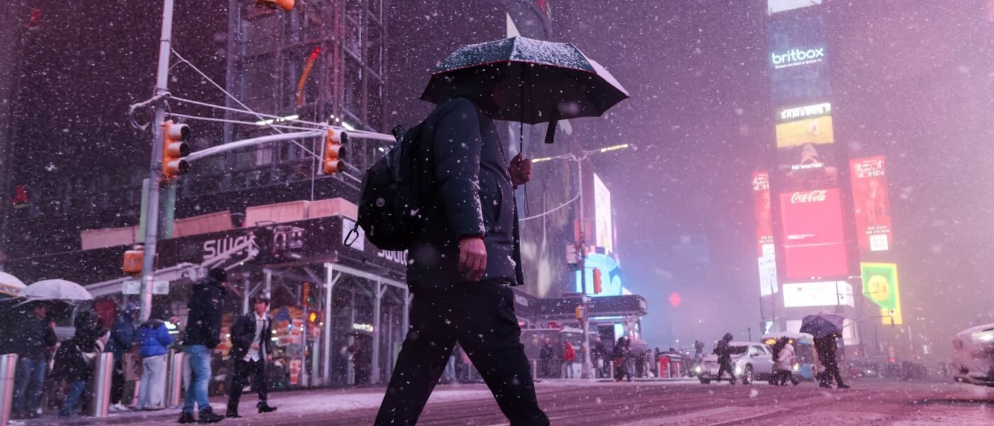 Pedestrians in the snow at Times Square during a winter storm in New York, US, on Sunday, Feb. 22, 2026.