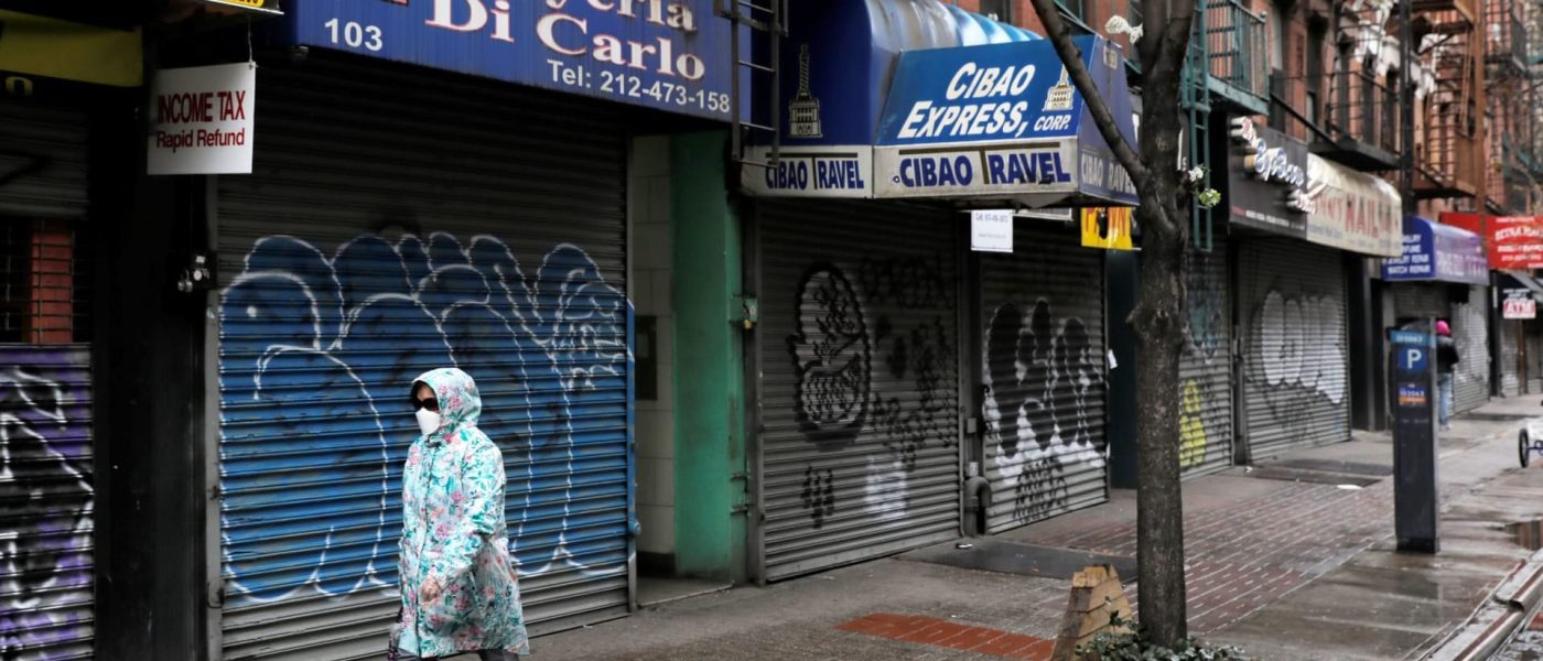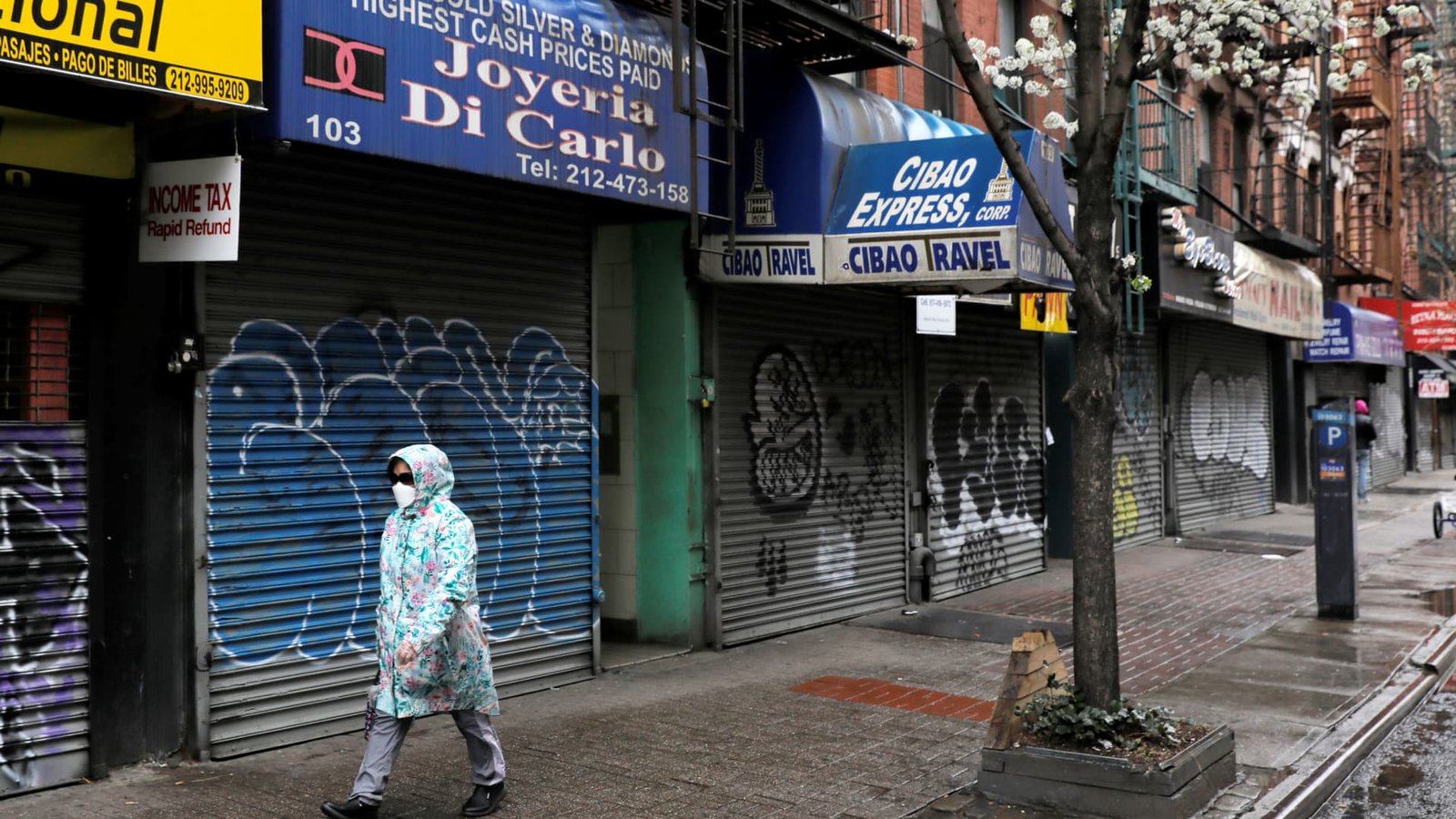 A person walks by a row of stores closed during the outbreak of Covid-19 in New York, March 28, 2020.