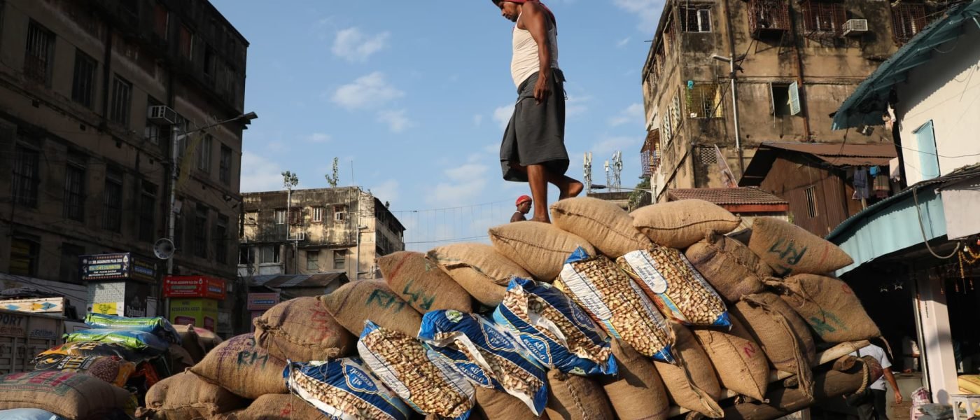 A laborer loads consumer goods onto a supply cart at a wholesale market in Kolkata, India, on November 11, 2024.