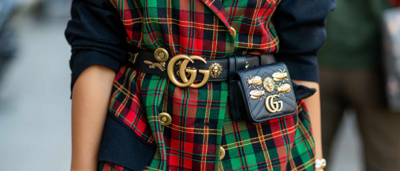 A woman wearing a Gucci belt and bag is seen during Paris Fashion Week in September 2018