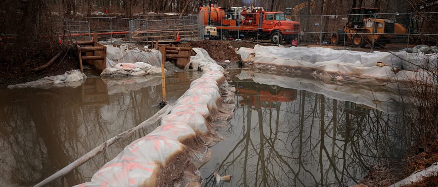 Earthen barriers near Lock 10 on the C&O Canal help redirect sewage back into the Potomac Interceptor after a section of the six-foot-wide sewage pipe collapsed last month between the Clara Barton Parkway and the canal on Feb. 16, 2026 in Cabin John, Maryland.