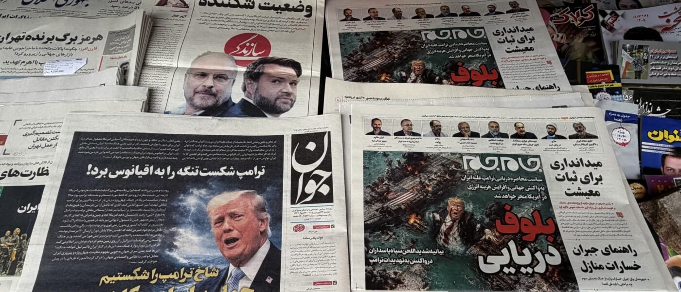 The front page of the Javan newspaper (L) and the front page of the Jam Jam newspaper, which features a cartoon of US President Donald Trump drowning in the Strait of Hormuz with the headline “Marine Bluff,” are on sale at a newsstand in Tehran on April 13, 2026.