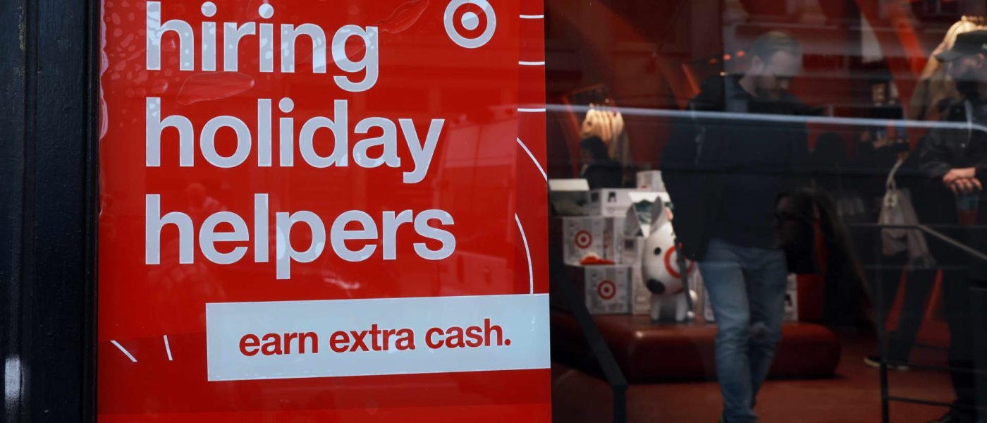 A hiring sign is displayed in the window of a business in Manhattan on Nov. 27, 2025 in New York City.