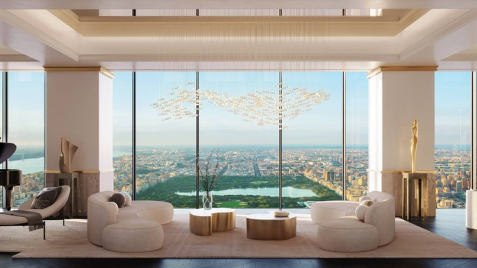 The property in question is a rare bundled offering atop the landmark Steinway Tower at 111 West 57th St. Penthouse 80 and Penthouse 82 are being marketed together as a potential quadplex, spanning the tower’s top four levels, which feature private elevator access. Combined, they offer 11,480 square feet, five bedrooms, six bathrooms, multiple lounges, and a 618-square-foot terrace with sweeping views of Central Park and both rivers on either side of Manhattan.