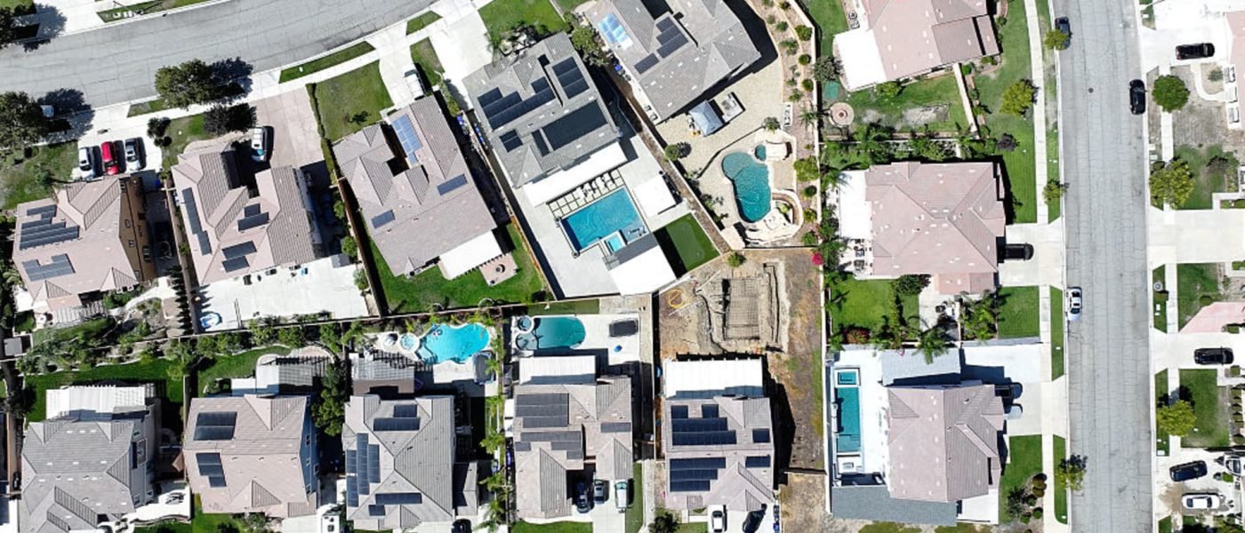 An aerial view of residential homes, many with solar panels, on Sept. 17, 2025 in Fontana, California.