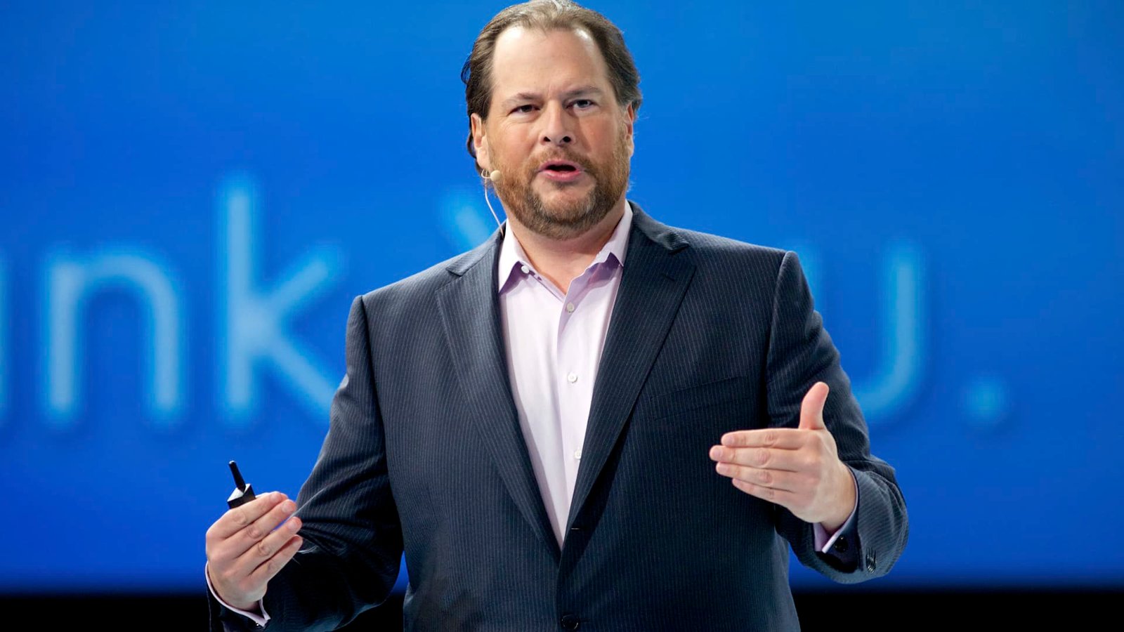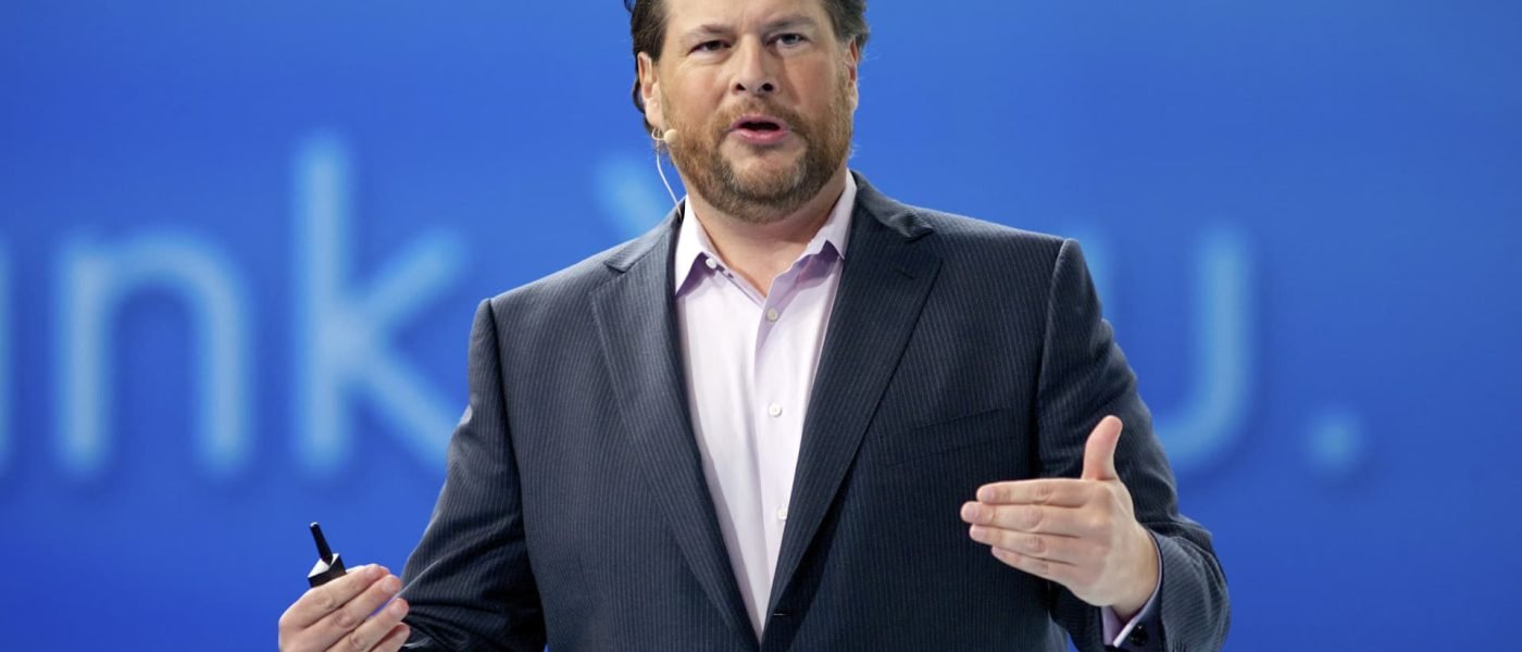 Marc Benioff, CEO of Salesforce, appears on a panel at the World Economic Forum in Davos, Switzerland, on Jan. 18, 2024.