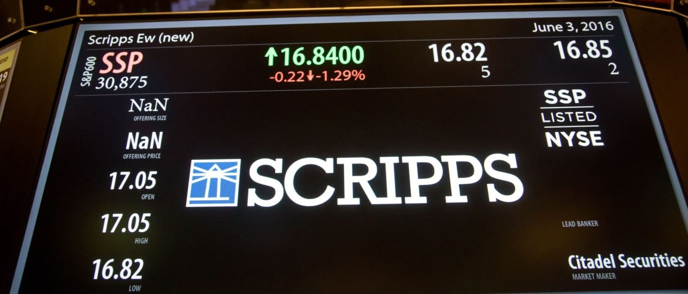 FILE PHOTO: E.W. Scripps Co. signage is displayed on a monitor on the floor of the New York Stock Exchange (NYSE) in New York, U.S., on Friday, June 3, 2016.