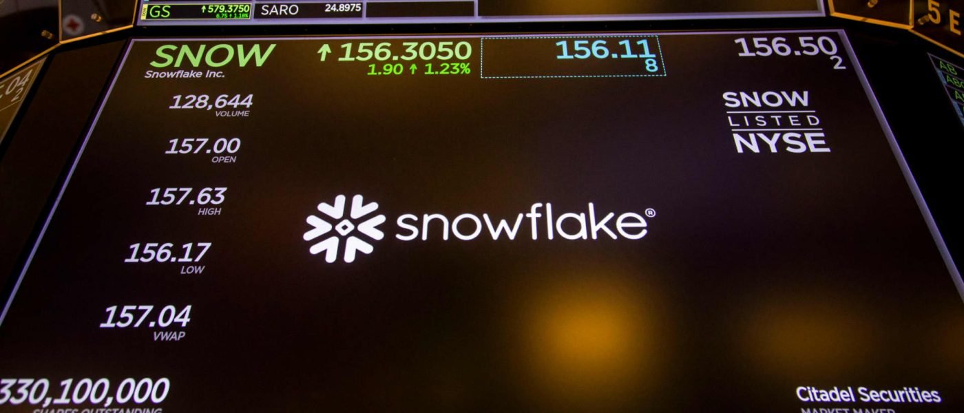 Snowflake Inc. signage on the floor of the New York Stock Exchange in New York, US, on Jan. 2, 2025.