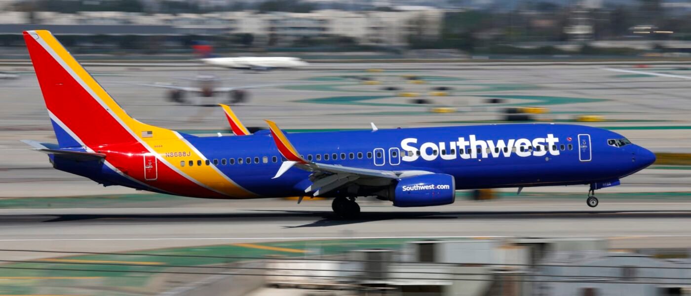A Southwest Airlines Boeing 737 airplane lands at Los Angeles International Airport after arriving from Chicago on March 7, 2026.