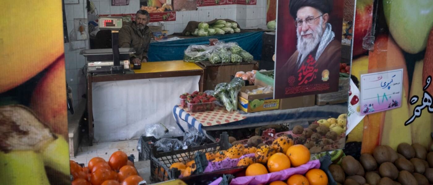 An Iranian salesperson sits beside a portrait of Iran’s late Supreme Leader Ayatollah Ali Khamenei at his fruit shop in the Shahid Boroujerdi residential complex in southern Tehran, Iran, on April 14, 2026.