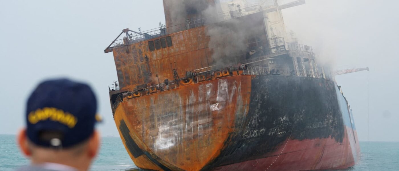 A foreign tanker carrying Iraqi fuel oil damaged after catching fire in Iraq’s territorial waters, following unidentified attacks that targeted two foreign tankers, according to Iraqi port officials, near Basra, Iraq, March 12, 2026.