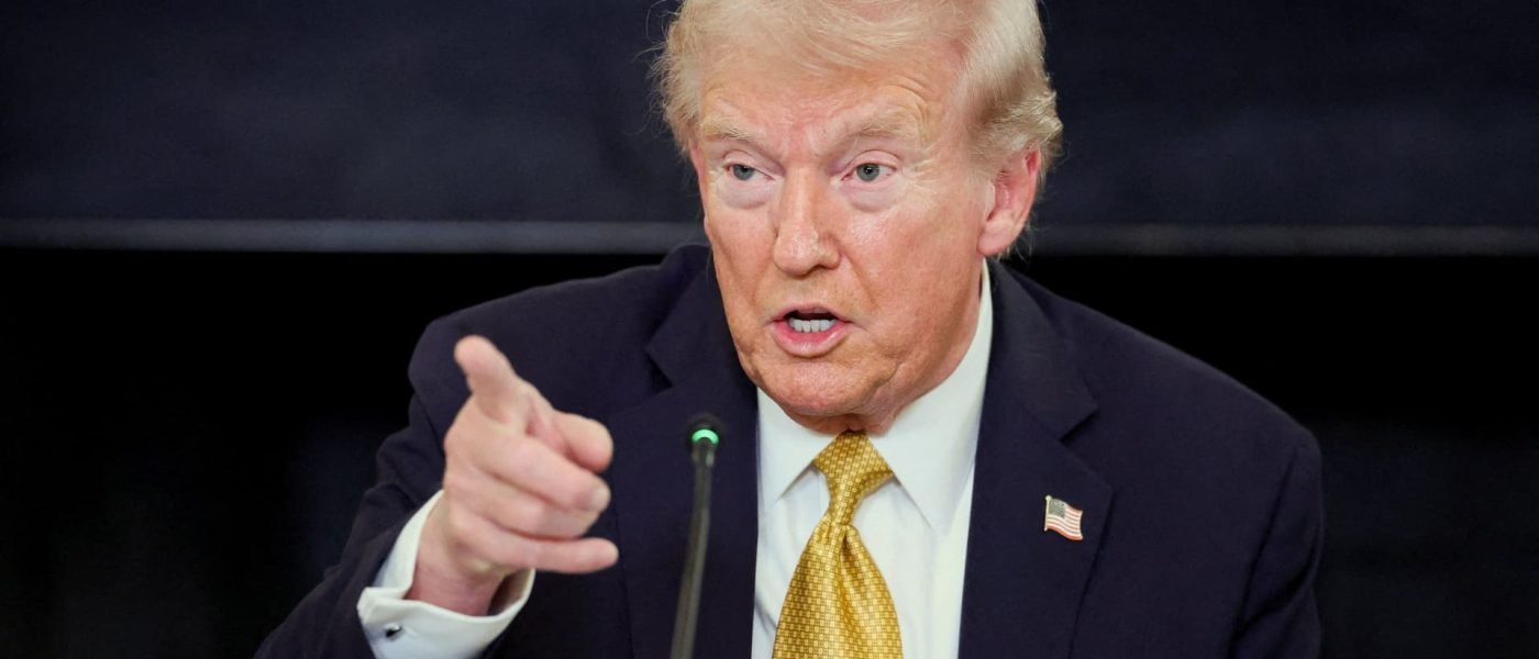 U.S. President Donald Trump gestures during an announcement from the State Dining Room at the White House in Washington, D.C., U.S., Oct. 23, 2025.
