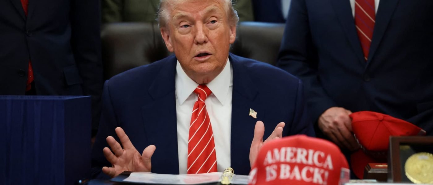 President Donald Trump sits at his desk, behind a hat that reads “America is back” at the White House in Washington, Feb. 3, 2026.
