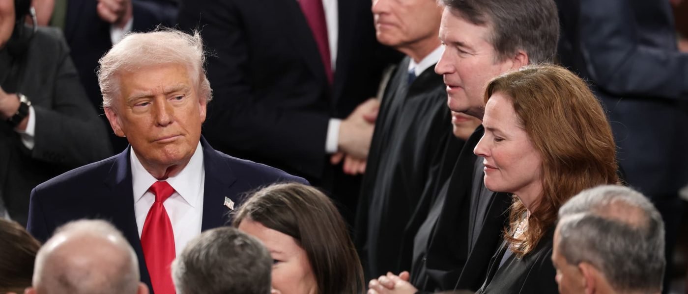 President Donald Trump walks past Supreme Court Chief Justice John Roberts, Associate Justice Elena Kagan, Associate Justice Brent Kavanaugh and Associate Justice Amy Coney Barrett as he arrives for the State of the Union address during a Joint Session of Congress at the U.S. Capitol on Feb. 24, 2026, in Washington, D.C.