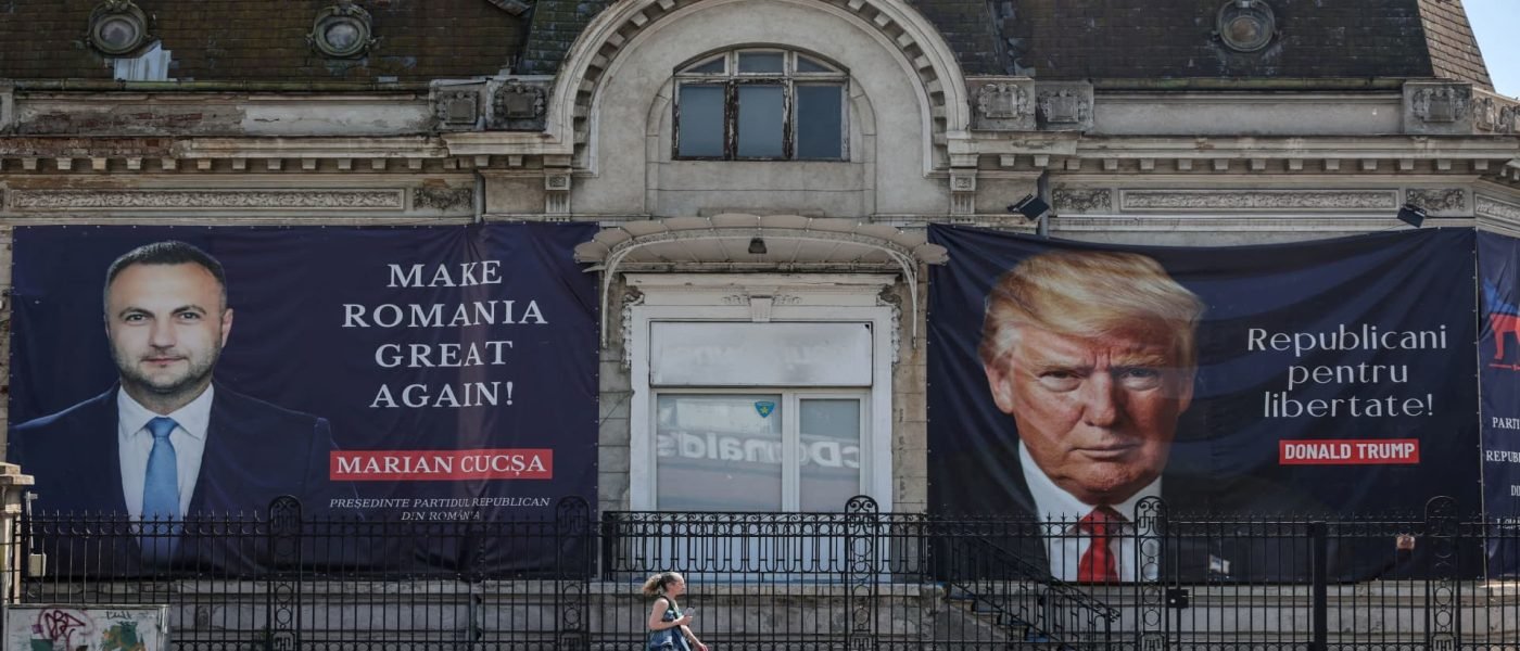 A person walks past banners showing U.S. President Donald Trump and Marian Cucsa, candidate of Republican Party of Romania, on the day of Romanian presidential election, in Bucharest, Romania, on May 4, 2025.