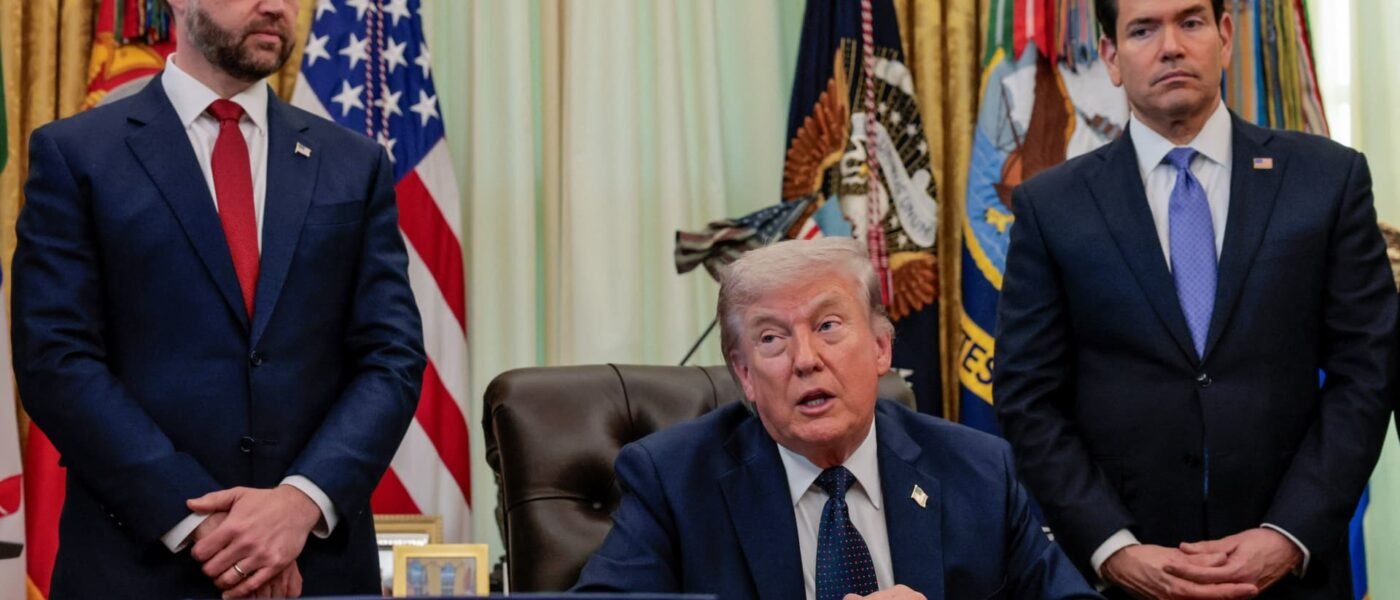 U.S. President Donald Trump speaks in the Oval Office, with Vice President JD Vance and Secretary of State Marco Rubio standing behind him, at the White House in Washington, D.C., U.S., April 23, 2026.