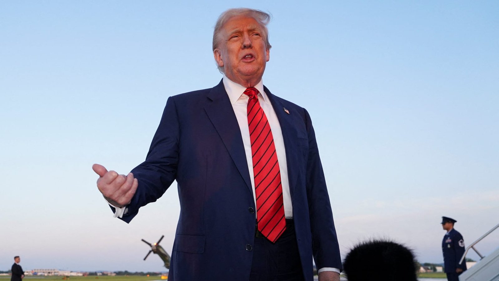 U.S. President Donald Trump talks to members of the press at Lehigh Valley International Airport in Allentown, Pennsylvania, U.S., August 3, 2025.
