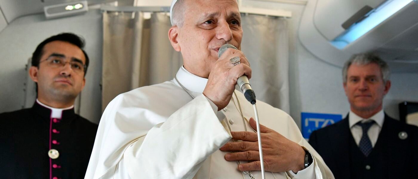 Pope Leo XIV responds to questions regarding US President Donald Trump’s recent statements during the flight to Algeria on April 13, 2026 in Algiers, Algeria.