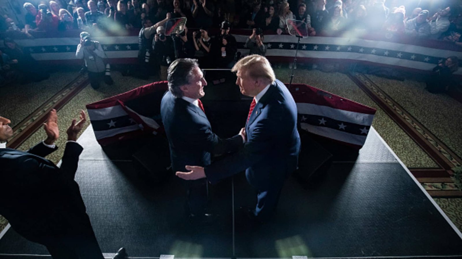 Republican presidential candidate and former President Donald Trump shakes hands with North Dakota Gov. Doug Burgum as Vivek Ramaswamy, left, watches at a campaign rally at The Margate Resort in Laconia, New Hampshire, Jan. 22, 2024.