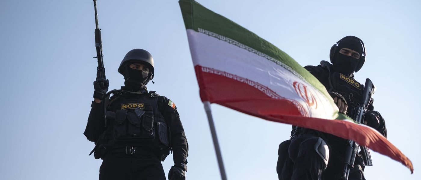 Two armed members of Iran’s police special forces stand behind a country flag placed on an armored military vehicle during a pro-Government rally in downtown Tehran, Iran, on January 12, 2026.