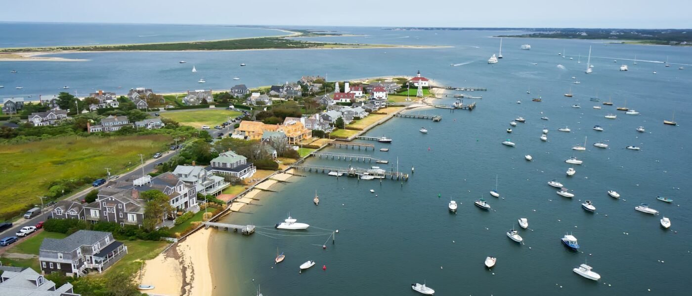 Kite aerial of Brant Point and harbor and Coatue, Nantucket, MA.